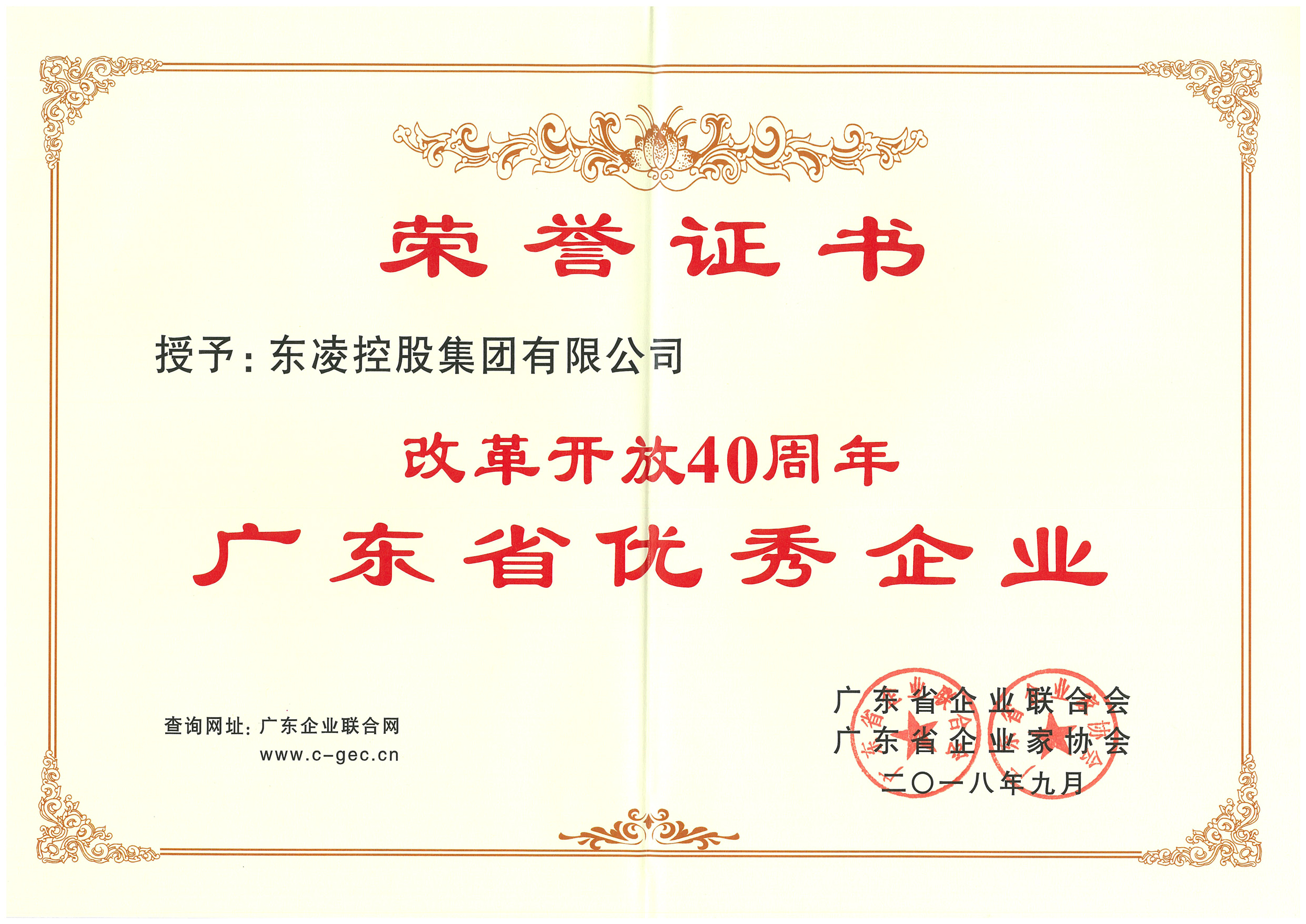 改革开放40周年广东省优秀企业荣誉证书