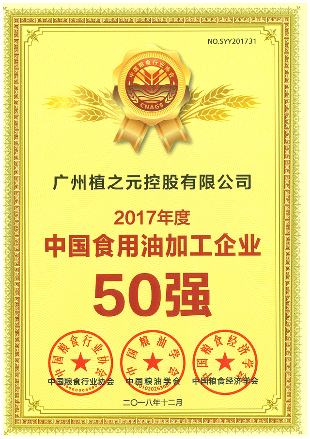 2017年度中国食用油加工企业50强荣誉证书