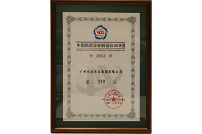 广州多宝(中国)官方实业集团有限公司荣获国民营企业制造业500强--2012年